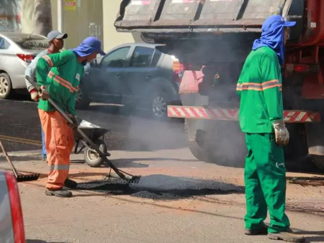Operários durante trabalho de tapa-buraco em Campo Grande (Arquivo/Campo Grande News)